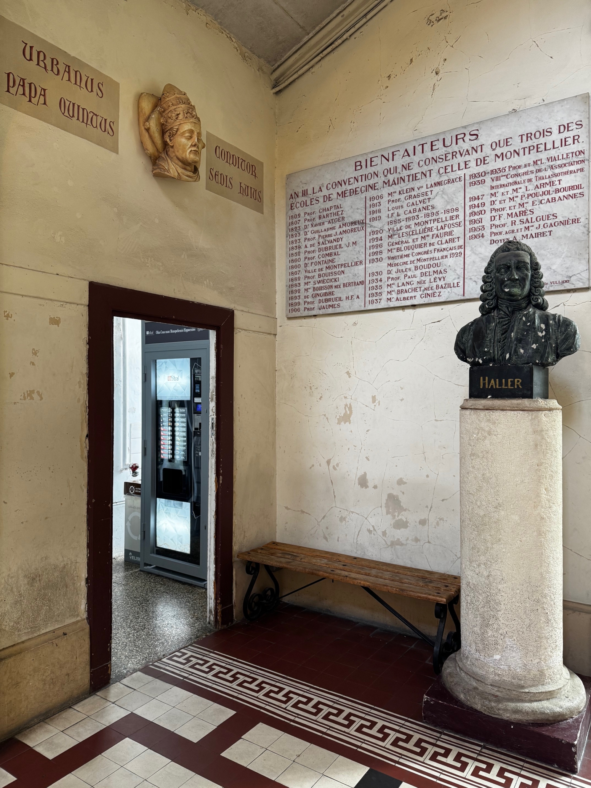The hall (or atrium) is a living testament to the city’s academic and religious history, with roots dating back tothe 14th century, when Guillaume de Grimoard—who later became Pope Urban V—decided to build the city’s first building dedicated to students, the College of Saint Benedict, where you are now standing.