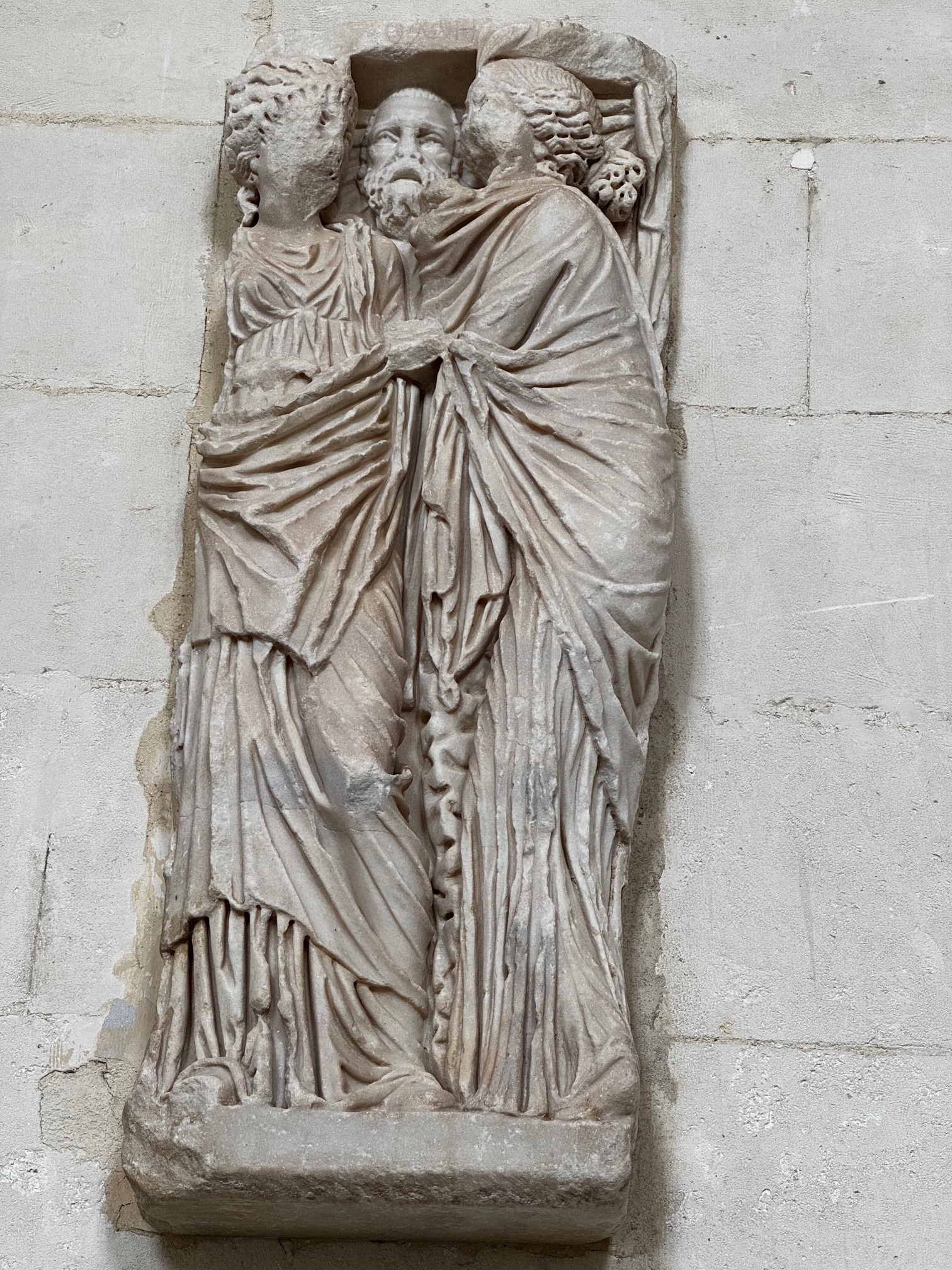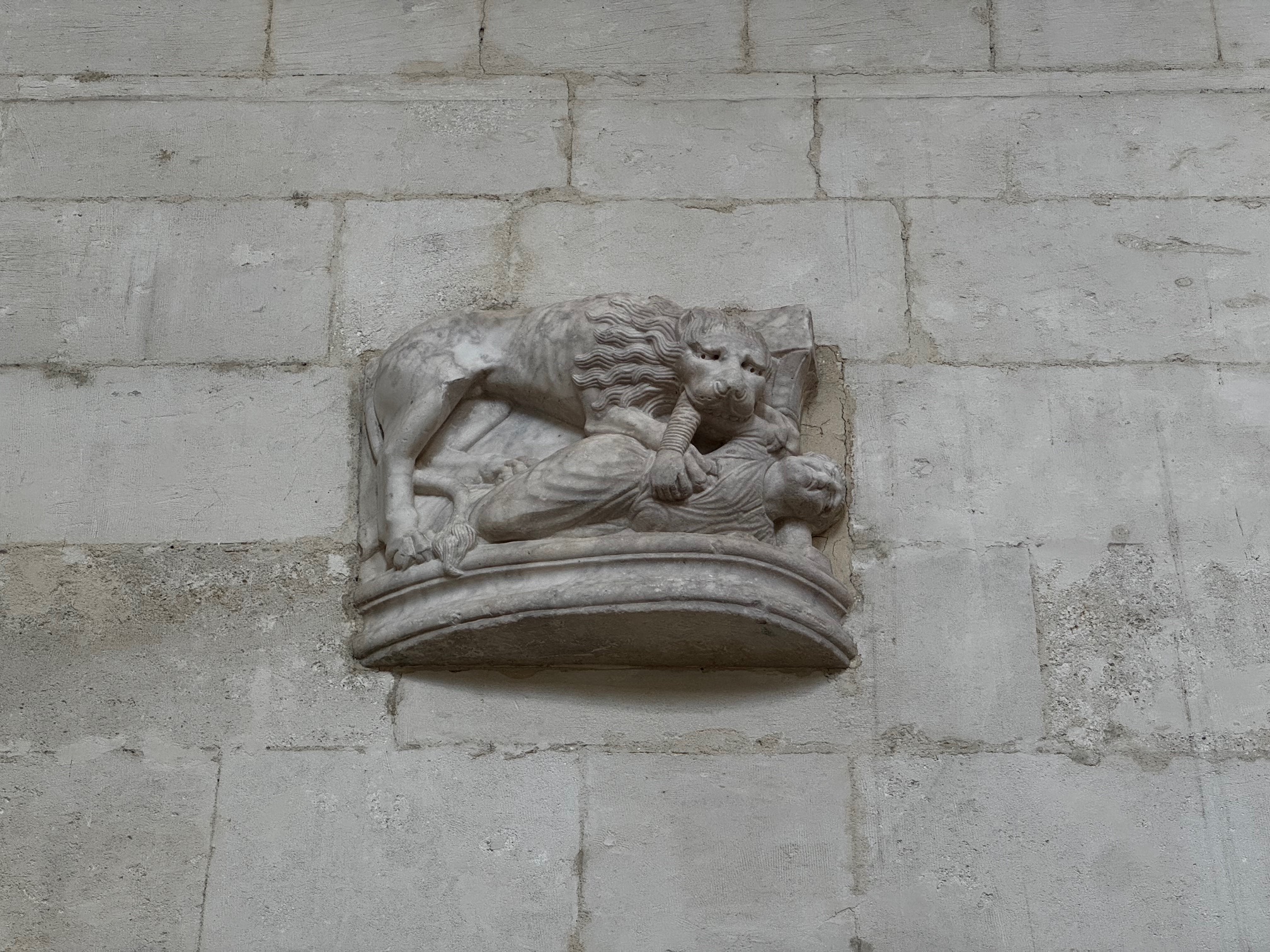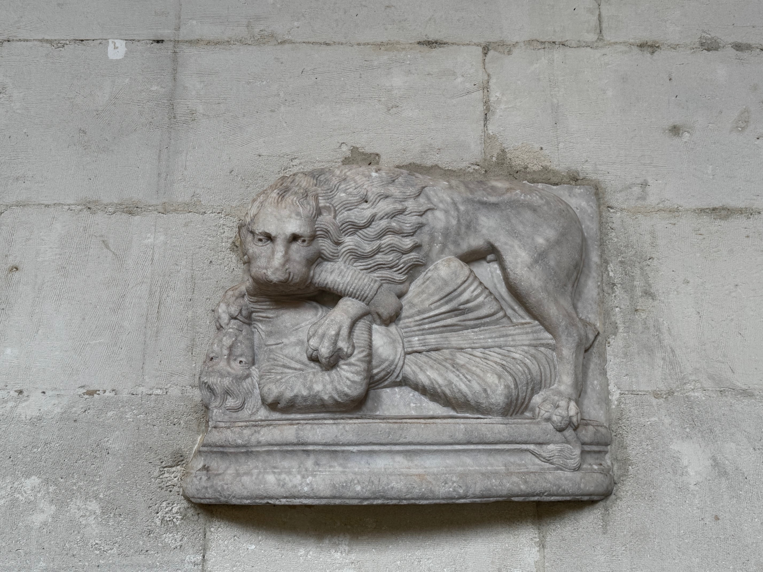 The marble sculptures, displayed on the grand staircase leading to the library, come from the Arena of Nîmes. They were brought to Montpellier in the 1620s by Ranchin, chancellor of the University of Medicine (the equivalent of today’s dean). Two bas-reliefs depict lions devouring unfortunate victims, while the central bas-relief depicts Homer (according to the name engraved at the top) and his muses, Tragedy and Comedy.