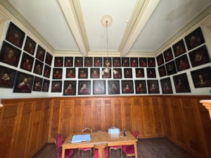 This room houses the very first gallery of portraits of professors. These 59 paintings, most of which were created in the17th century, depict distinguished chancellors, deans, professors, and surgeons. Some of the figures, likely painted after the fact, date back to the University’s earliest days. The physicians wear their dark red academic gowns (which lacked ermine trim prior to the18th century), while the barber-surgeons are distinguished by their black gowns.